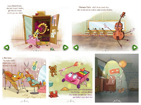 这是一本以乐器为主角的英文读物,将18种不同的乐器组建成一个同住在一栋楼内的几户小家庭,让孩子们在读故事的时候能够从形象、声音等各个方面直观的增强对各种乐器的认知。