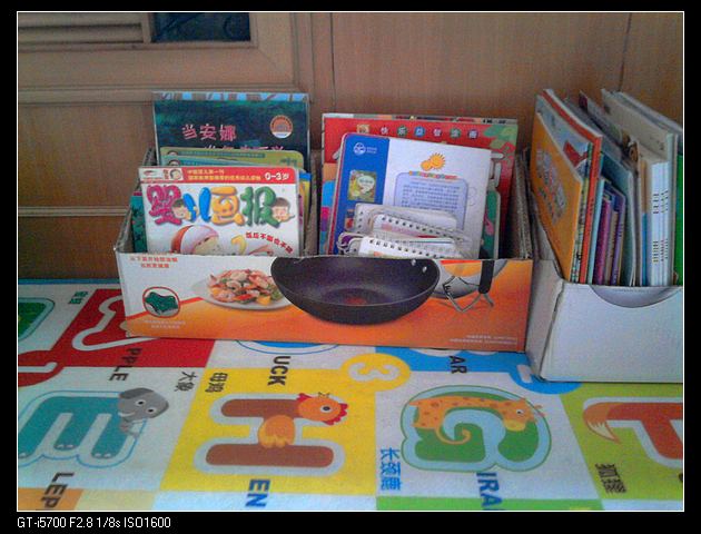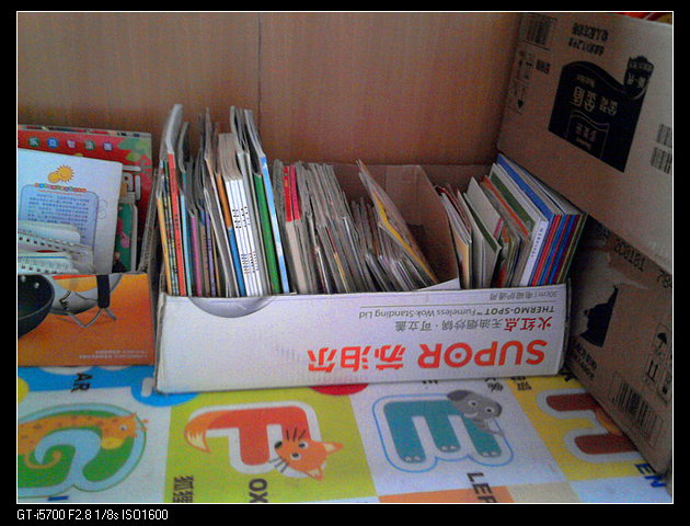 家里的书在书柜里放着,宝宝自己不好取,我妈给弄了个储物箱,也很不方便,家里书都乱堆着,宝宝想看那本自己取。早就想做一个纸箱子书架,一直懒得动手,那天正好老爸买了口锅回来,我看着箱子大小正合适,本来想着是竖着分两个的,老爸的建议好,横着划开,正好两个。