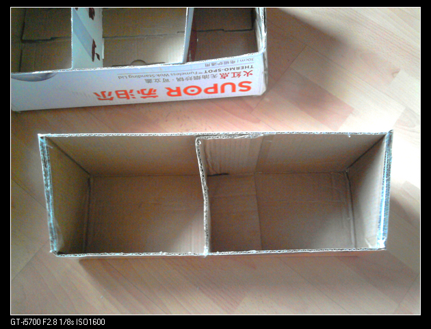 家里胶纸带没了,中间的挡板凑合粘了粘,也没买包装纸,就先这么用吧,反正将来还得再做几个呢。能看出来一个宽一个窄吧。