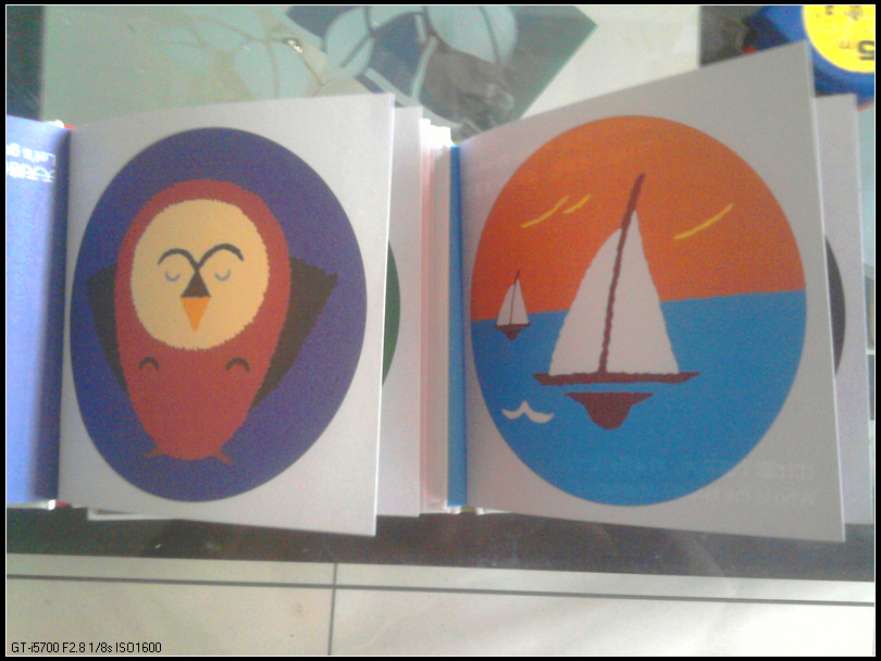 这只猫头鹰胖胖的,胸前的两道弧线像缩起来的小爪子;橙色的天空蓝色的海面,白色的风帆自由徜徉。