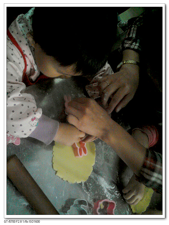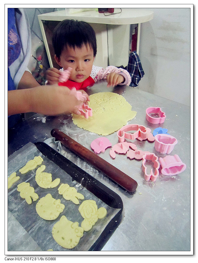 阿牛是个男孩子,跟老妈开心得玩了一会,跑开了。牛妈倒是兴致挺高,活面、压模,非常开心。看看面还不少,牛妈叫婷过去,玩一玩。婷最喜欢小兔子,让我把每个小兔子的图案都拿过来,做了好几块小兔子饼干。婷学得很快,先把母模具放下去,在把子模具放进去,使劲按,轻轻晃,一块漂亮的饼干分离开来。