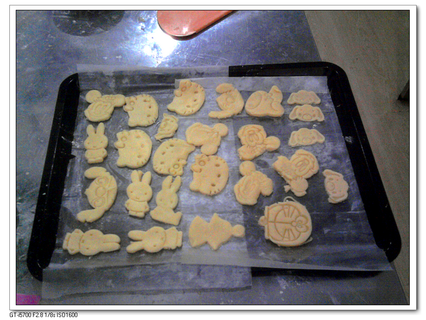 婷的兴致还挺高,一会要小狗,一会要螃蟹,最喜欢的还是凯蒂和米菲。饼干先后出炉,我们的蛋糕胚还没烤好。牛妈送了几块饼干给宝宝,看着自己做的小兔子,宝宝都舍不得下口。闻一闻,浓香扑鼻;咬一口,奶香溢口。宝宝都不想做蛋糕,改做饼干呢。