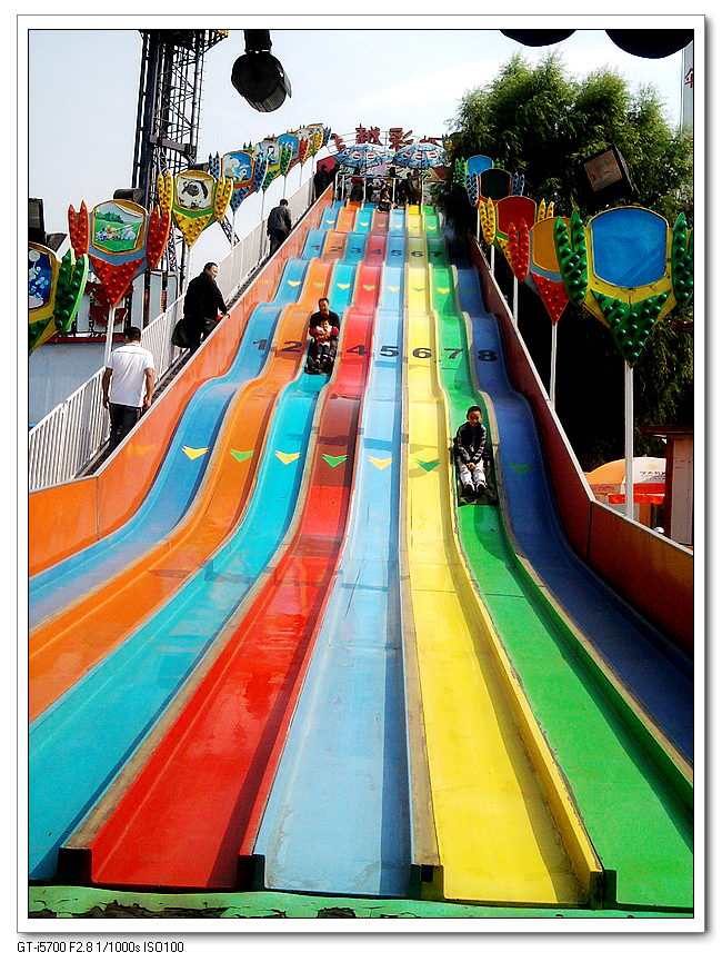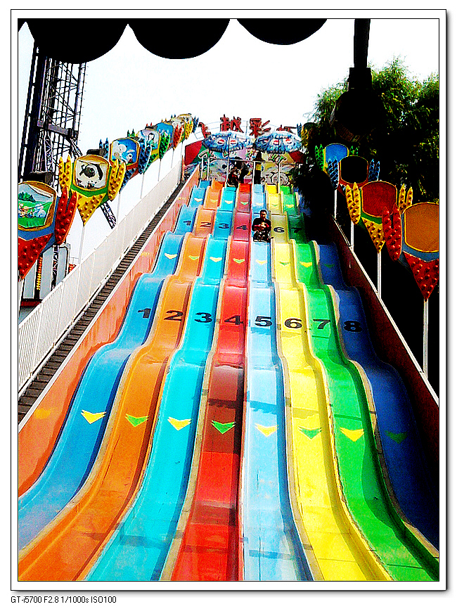 玩了些简单的项目,老公转了一圈回来,要带孩子去玩滑毯——滑梯很高,但中间有许多缓冲,坐在毯子上滑下来,有些刺激,但应该不会很害怕。宝宝看到滑毯那么高,说什么也不敢去玩,我们就抱着她在那里看了一会,我很认为,孩子最后同意去玩,最先的原因不是因为好玩,而是因为那个滑梯的颜色像彩虹,漂亮,而宝宝,对颜色漂亮的东西,十分没有抵抗力。