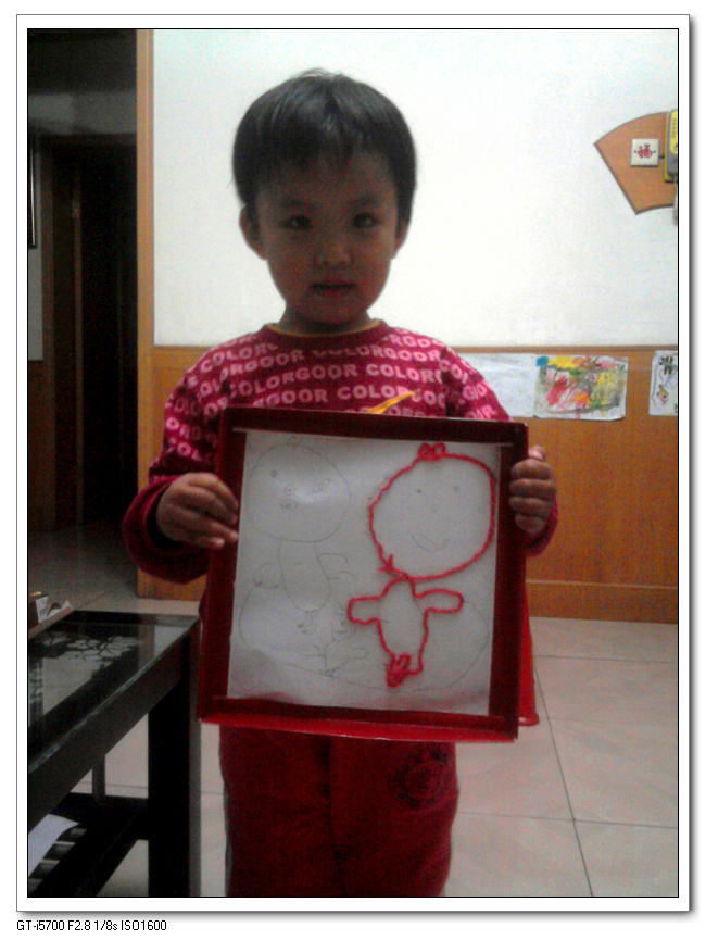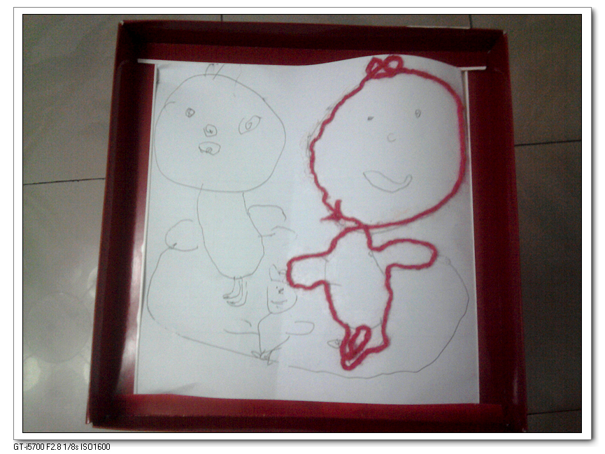 我们这张全家福不错吧,呵呵,她前两天画的,还跟我一起用毛线把妈妈勾勒出来,爸爸不用勾,爸爸是男的。