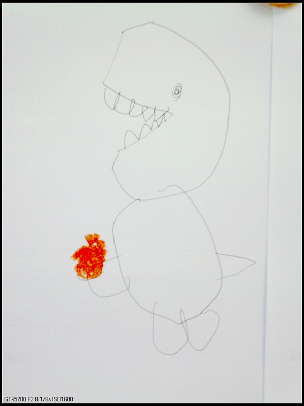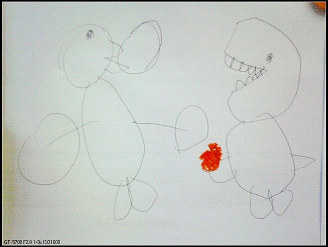 一个人吃多没意思,于是画了个蛋,蛋里面孵出来一只小鸡,小恐龙请小鸡吃苹果。