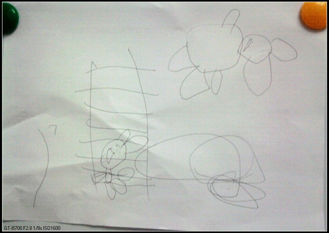 上上星期五晚上,宝宝在画板上猛画了半天,我听她给我讲她画的画,讲着讲着,宝宝突然找出了以前她画的几幅画,然后让把它们订起来,写上书名和作者。我问她书名叫什么,宝宝想了想说,叫《小兔子的歌》,真不错的名字啊。