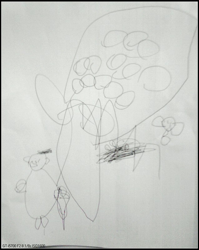 这就是那幅婷拿弹弓打蛇救鸟。树上结满了果子,右面中间那团黑乎乎的东西就是鸟窝,里面有小鸟。鸟爸爸长得可够胖的,嘴上叼着的那个圆形的不是果子,是虫子。树上常常的折线就是蛇,下面那个小人就是宝宝,手上拿着弹弓。——这是我给她讲完《爸爸和我》后,一次瞎编的故事,一人一根树枝,然后画树,画鸟,画蛇什么的,宝宝特别喜欢这个故事。