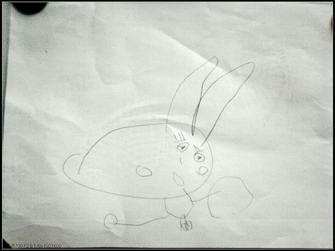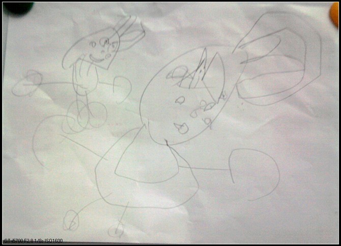 婷画的画也许不是特别像,但是我喜欢她的创意。在她的笔下,小兔子可以做很多事情,上床睡觉、浇花、玩滑板车、跟爸爸妈妈坐汽车去旅行、滑滑梯。作为一个刚刚3岁的孩子,我觉得她的画还是蛮不错的。