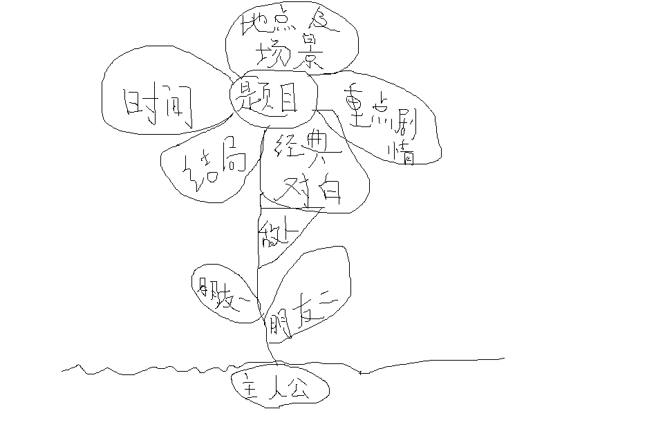 画个花心,可以空下,因为题目可能要到最后才能想到。然后时间、地点、想写个什么故事,一个一个往里面填,可以用非常简单的表述。比如我要写一个打败大灰狼的故事。经典对白呢,因为很多孩子都是喜欢用对白来说自己的故事;结局嘛是给孩子一个提点,并且给个暗示,看,编个故事就是如此简单。