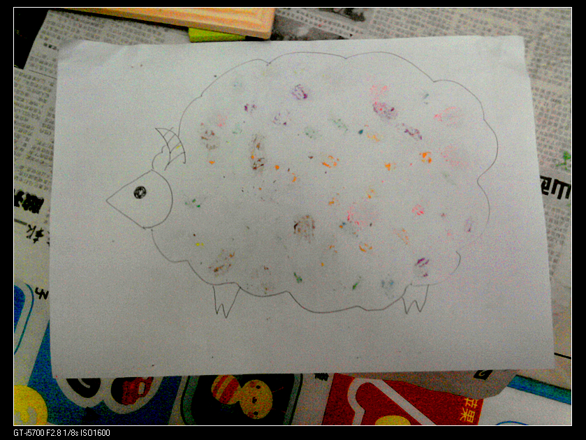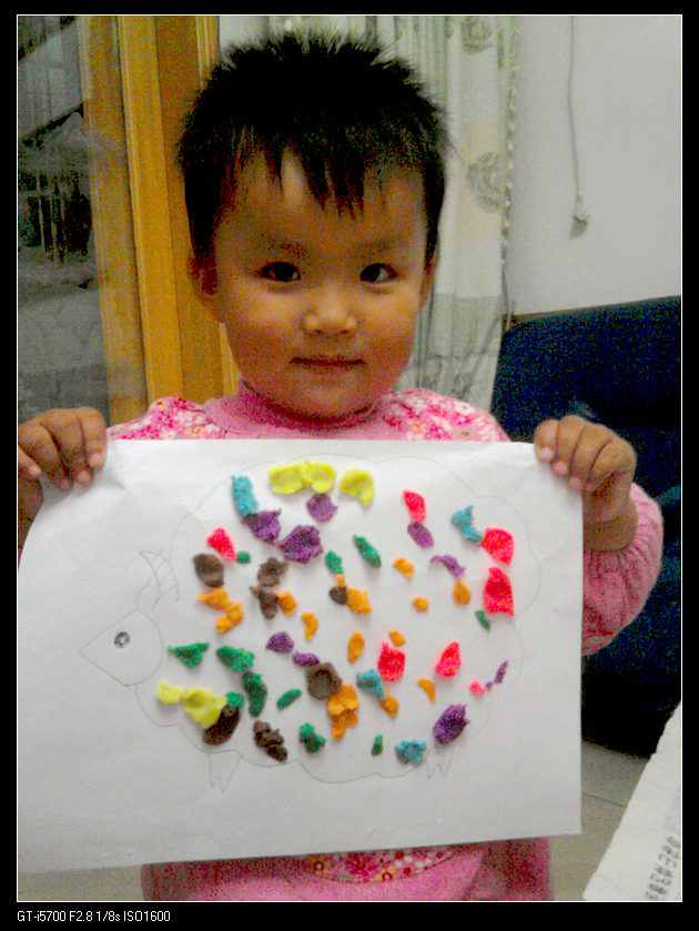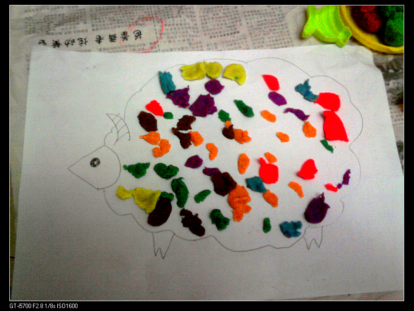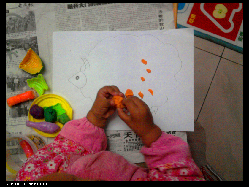 玩法四:给小绵羊穿衣服。宝宝很喜欢看《小小智慧树》,对里面给小蝴蝶/小绵羊穿衣服的游戏特别感兴趣。我们曾经把广告纸剪成碎片,然后用胶棒把它们粘在小蝴蝶/小绵羊/小鱼身上。