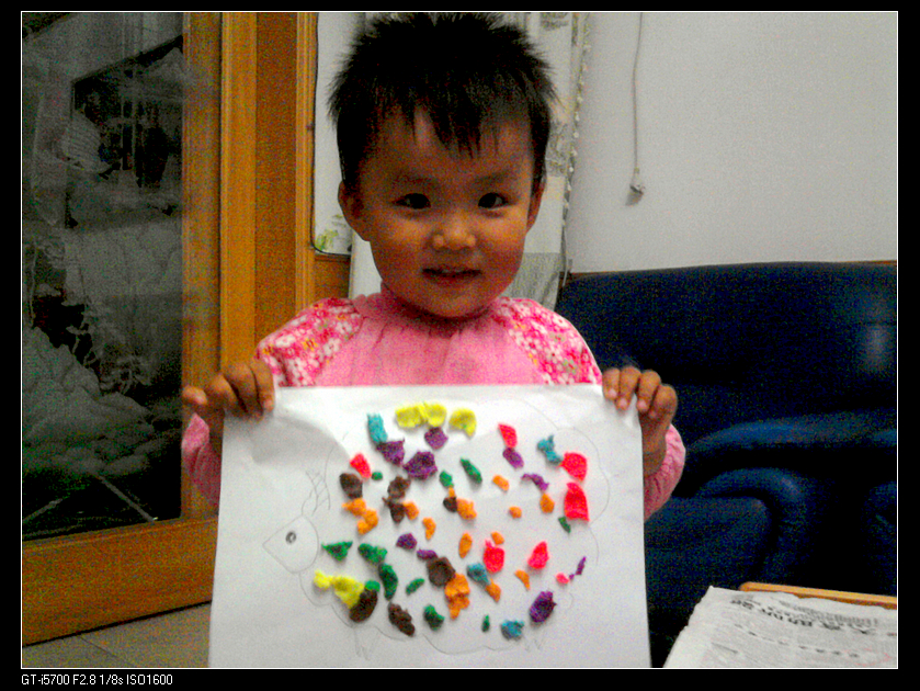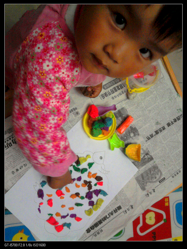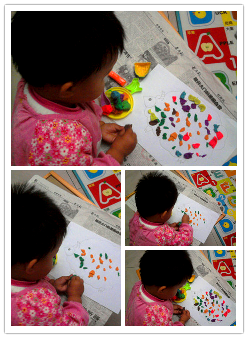 玩法一:用剪刀。宝宝两岁左右的时候我开始锻炼她用剪刀。最先买的一把安全剪刀,头是圆的,但锋刃还是不锈钢的,很锋利,比较危险。于是又买了塑料剪刀,一套三把,有两把能剪波浪线。可是由于塑料剪刀剪起来不如真剪刀顺畅,宝宝缺乏成就感,她还是更喜欢用“妈妈”的剪刀(前面说的那把安全剪刀)。为了锻炼她的小手,我在让她用安全剪刀的同时,让她用塑料剪刀剪橡皮泥。橡皮泥软,容易剪,而且用塑料剪刀能剪出花边来,宝宝很喜欢。
