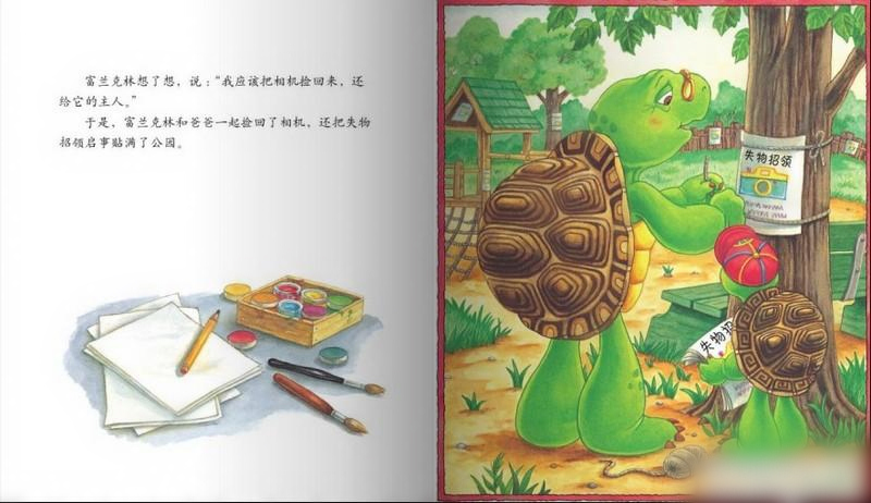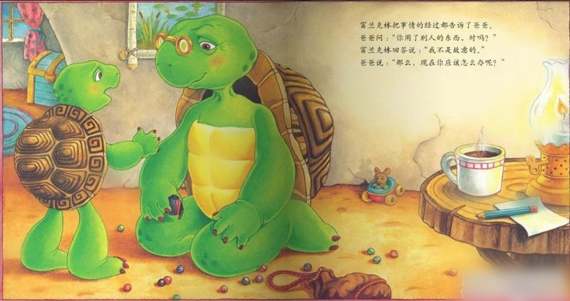 看看墙上的裂缝,和富兰克林家里的摆设,这应该是一个普通的家庭,在这种环境下爸爸没有让富兰克林拾金而昧,而是教育他应该怎样对待那些不属于自己的东西。我喜欢公主王子那种华丽的场景,也喜欢这种平和温暖朴实的色调和画面,我的孩子也是出生在这样一个朴实的家庭,我希望她在有美丽的憧憬时,更能先有一个良好的世界观、人生观和价值观。