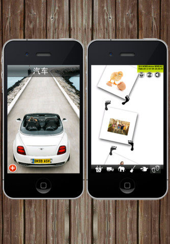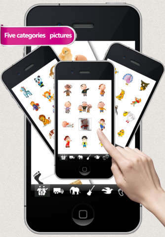 这是一款针对2到4岁的孩子设计的认知类应用,涵盖了包括家庭、交通、动物、乐器、飞鸟五大类在内的各种实物认知,每一类各有12个不同内容,分别以图片的形式显示。第一次使用的时候,有5张图片供免费使用,其他的都必须要另外购买。