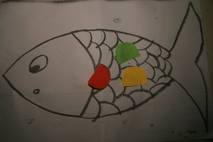 另外,老师还把TT的一幅手工作品给了我,是在一条画好的大鱼上粘上鱼鳞。我瞟了一下其他孩子的成果,有一两条大鱼的鱼鳞比TT的少,但多数都很多。还没来得及问TT为什么就粘了这么少的几片,TT就自豪地伸出三个手指头告诉我:“妈妈,我粘了三片鱼鳞,就三片!”特意强调的数字三,让我恍然大悟——我的TT喜欢3这个数字,什么都要和3相关的东西,就是给她再多的鱼鳞,她也只粘三片!哈哈!