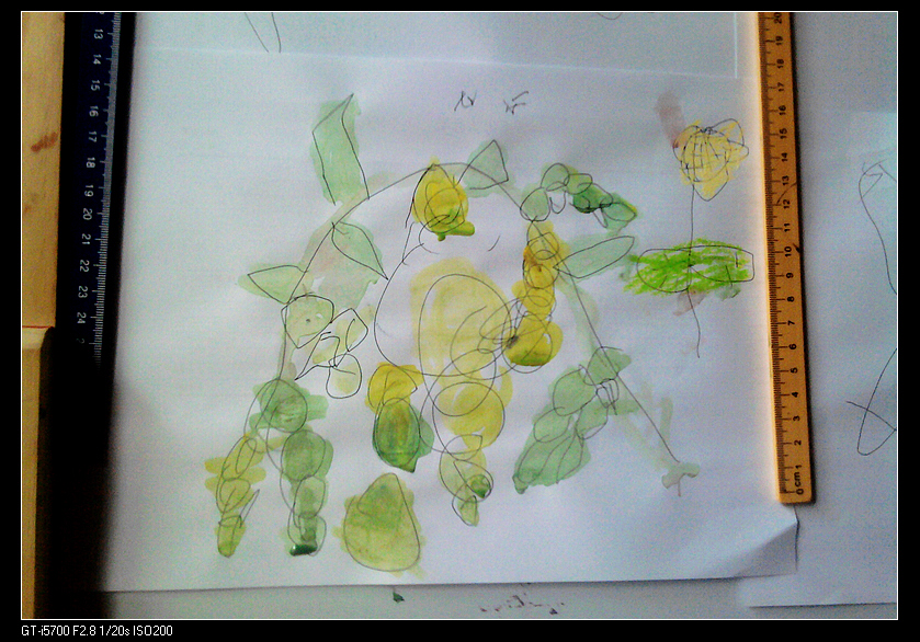 婷不是很喜欢蜡笔,我想可能是因为蜡笔的颜色不如水粉润泽,也不如它易扩散。以前都是让她拿水粉在纸上随便涂抹,就那样都能画上一个多小时不嫌烦。前天开始,她在自己的作品上涂色,很快就表现出了极大的兴趣,每天早晨醒来,第一件事就是先到画板前去画画。