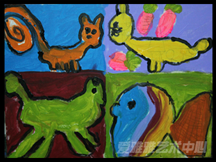 点评: 5岁小朋友小可爱的小身躯,画出来的风格却是大气稳健的。这幅动物世界的小作品色彩搭配大胆、对比强烈、构图饱满,感觉恰恰与这个小可爱有了个大大反差。