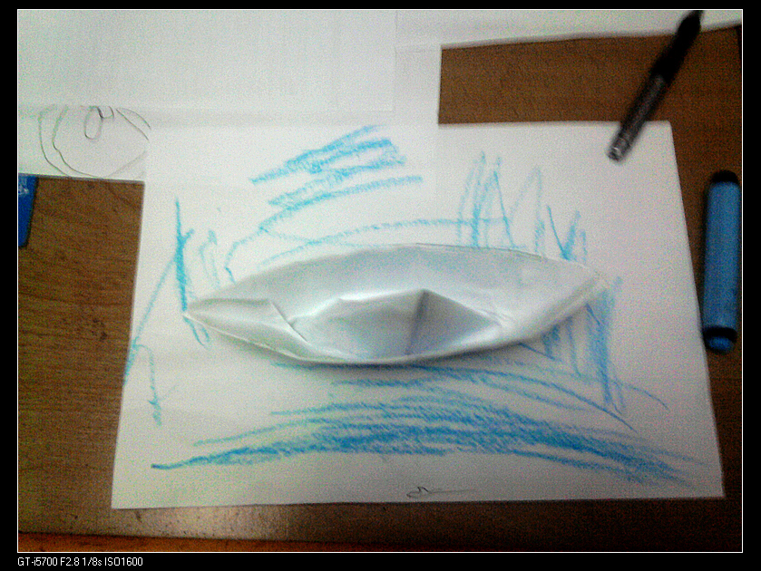 很久不叠小船,忘了怎么叠了,快下班前去网上搜了搜,很悲催,那个漂亮的乌篷船我竟然学不会……本来打算用纸盒子糊一个,后来拿张纸试着弄了弄,一艘我们小时候常叠的小船就出来了,省得我糊纸盒子了。