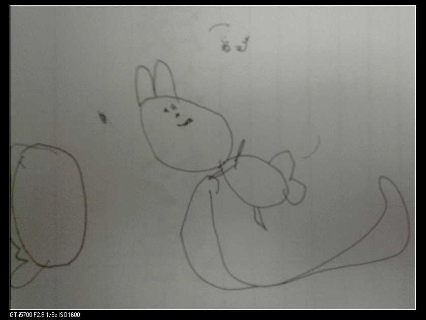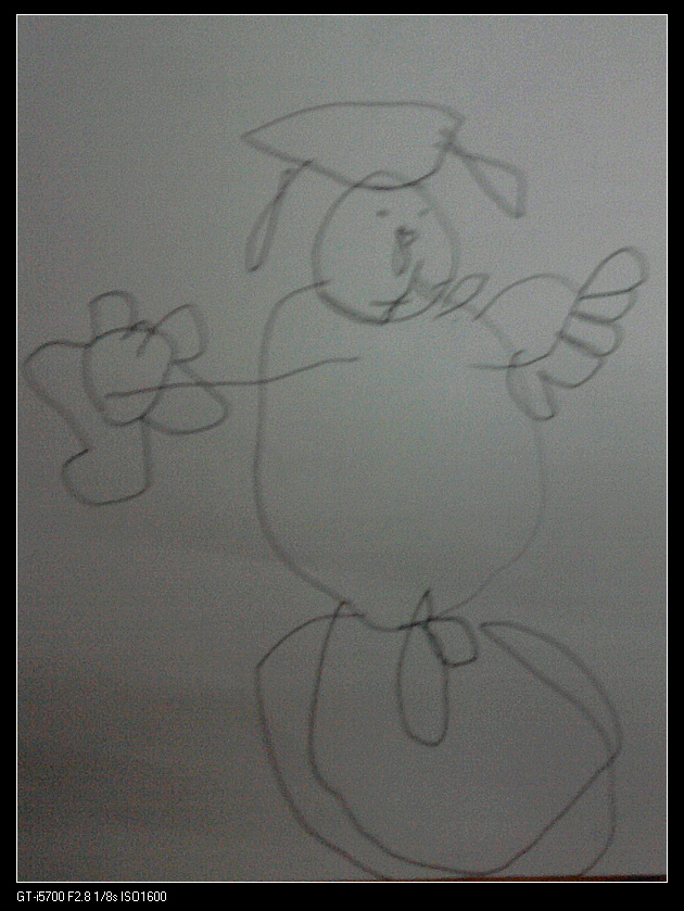 宝宝自己画的甘伯伯,下面那是她画的船。我对甘伯伯的帽子表示了称赞(观察还是很仔细的嘛)。