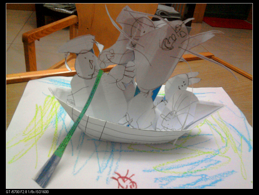 纸人物站不稳,我在他们后面贴了条硬纸。船桨是冰激凌勺子。