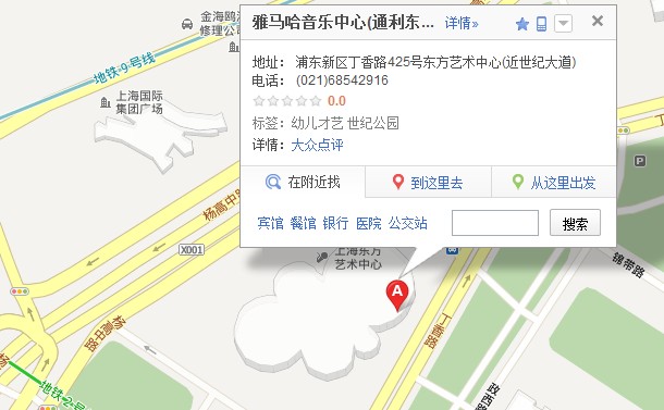 后来又到点评网站按地域,找到了周边几个。一个是东方文化艺术中心的“雅马哈音乐中心(通利东艺店),一个是上海绿城门口的贺绿汀艺术学校。