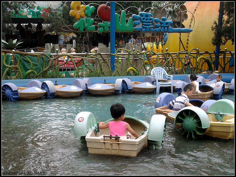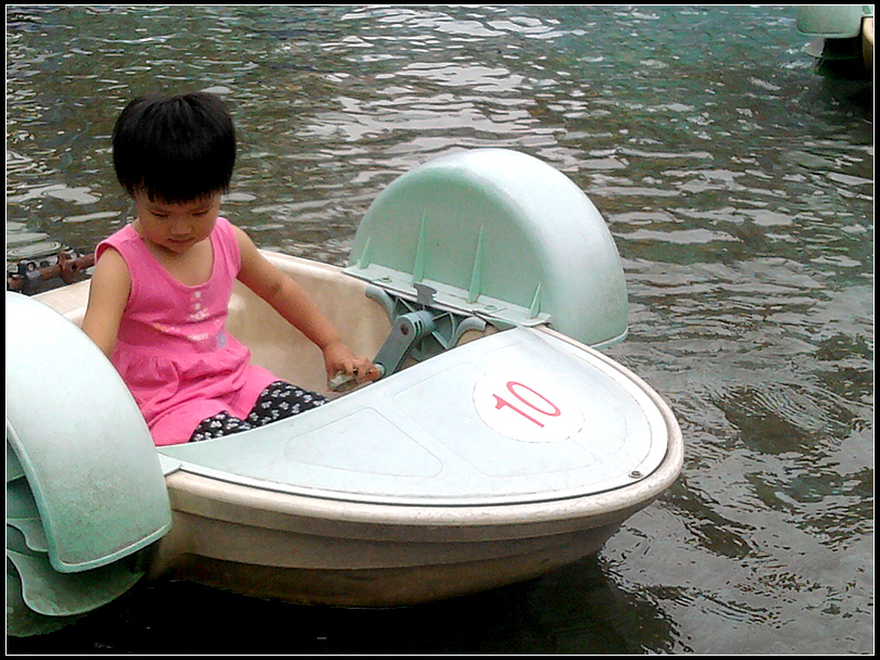 接下来直奔后面,去坐水池里的碰碰船,那是一个大的充气水池,水不深。需要宝宝自己划船,可是宝宝的协调能力还略差点,双手不同步,船老是打转。宝宝还把手伸到水里玩水。我去看了一会后面的XX儿童摄影,再扭头,我就被他们给甩丢了。
