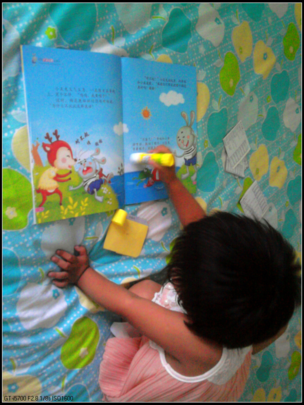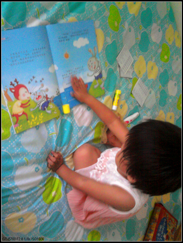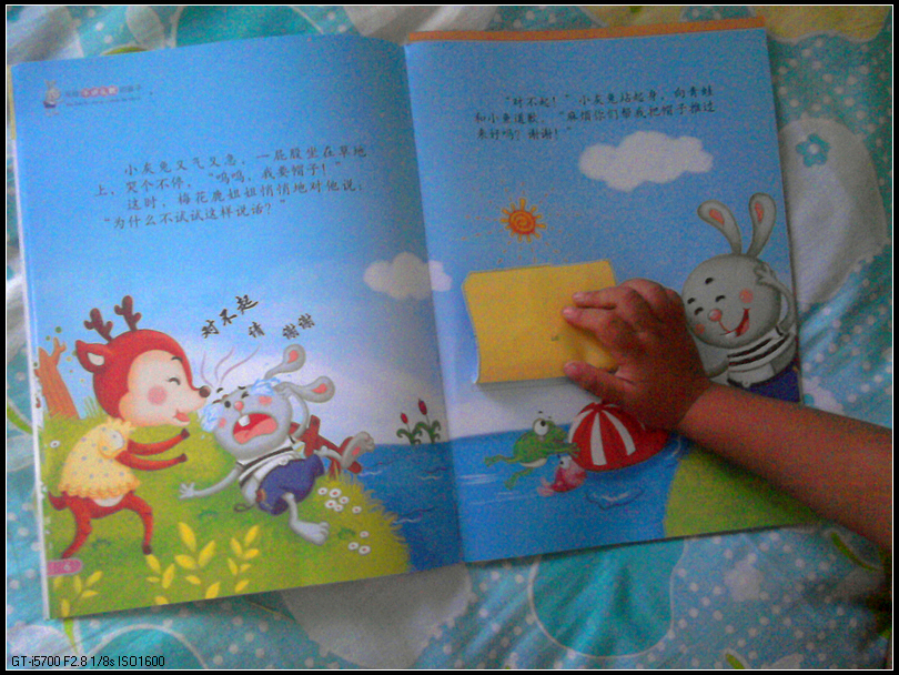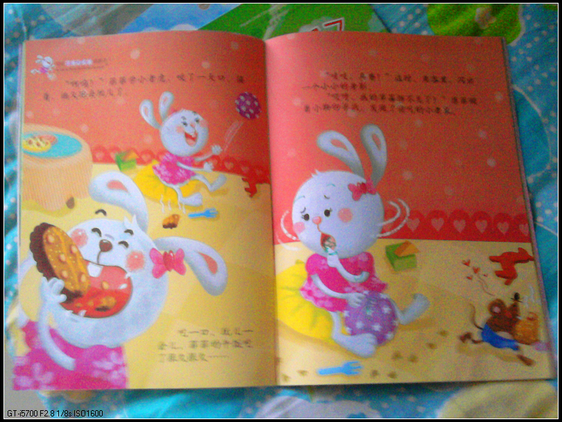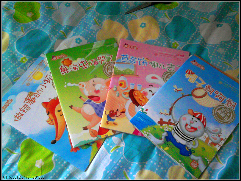 这次是宝宝自己翻出来的,每天早晨上班前给她讲一到两本,时间还算充裕。而且故事简短有趣,基本上是一些教育孩子礼貌、卫生、好习惯,也比较适合这个年龄阶段的宝宝。小动物的形象很可爱,而且,这本书是A4的,大大的,又不太厚,拿着很舒服。不过可惜看了没多久,有两本书的中页已经落了下来,我拿胶带纸粘上了。
